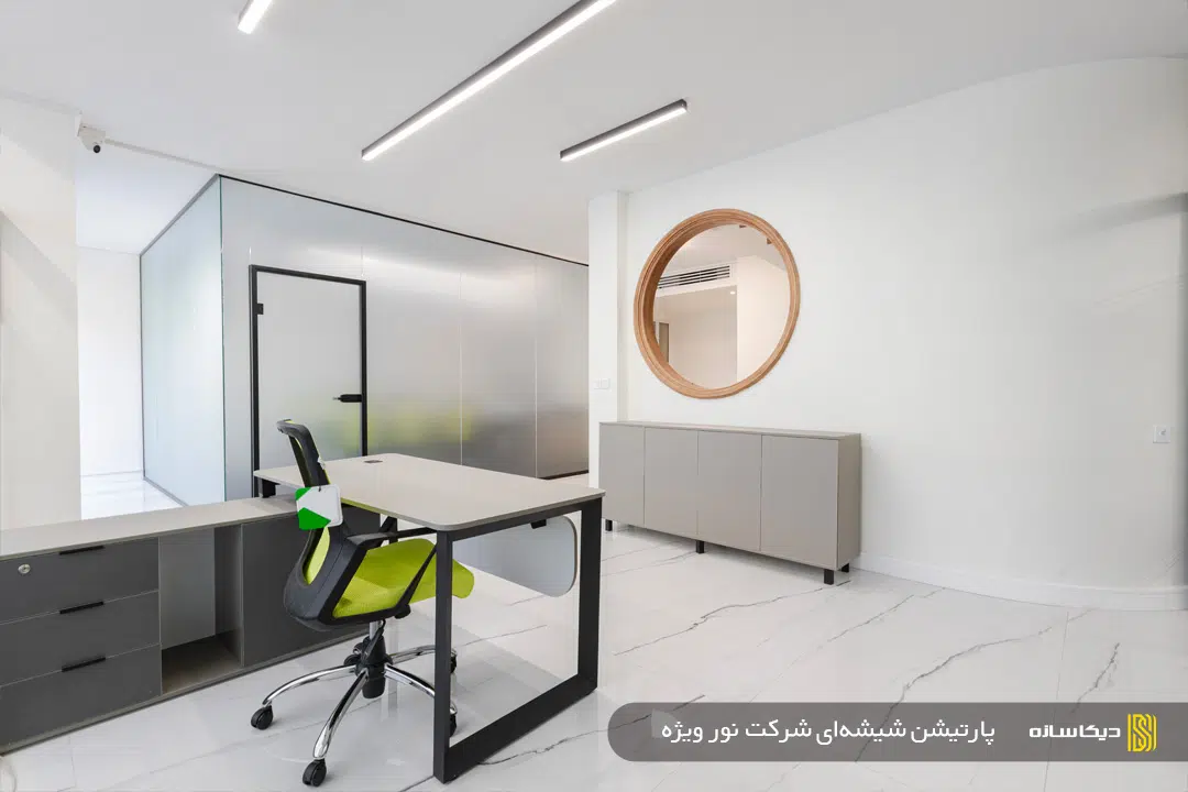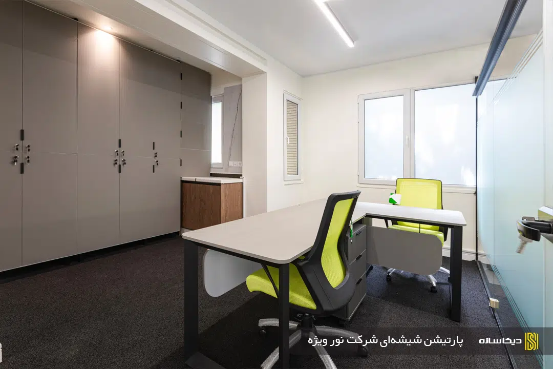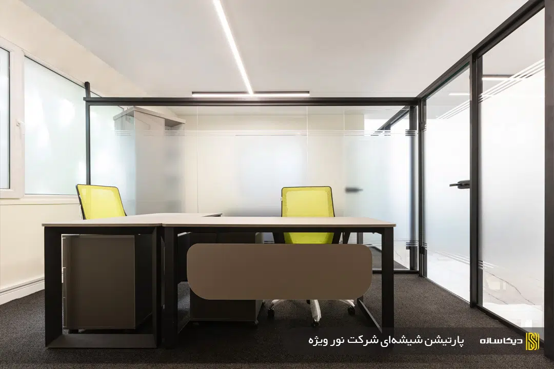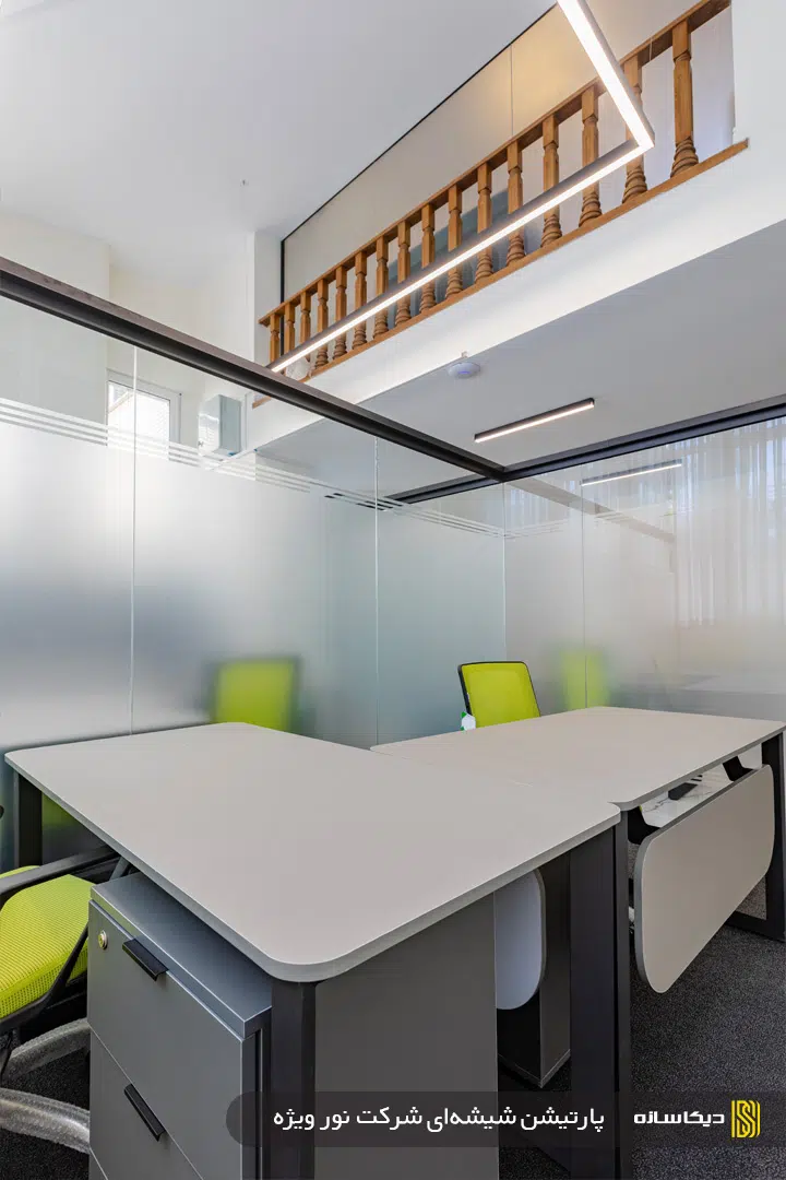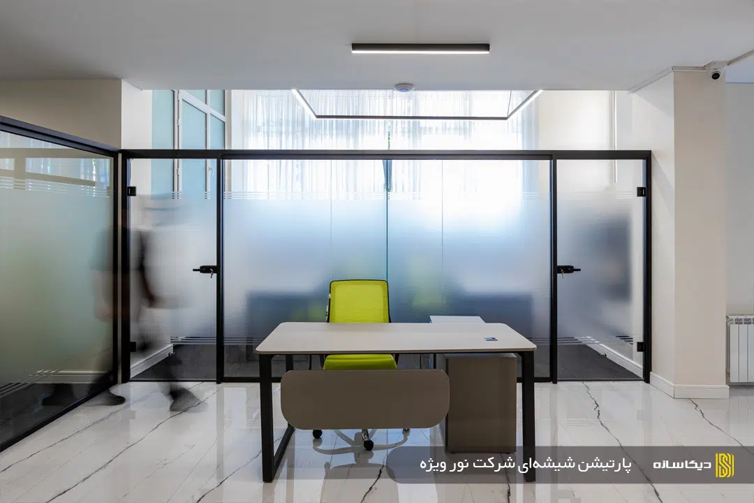 پارتیشن شیشهای و مبلمان اداری شرکت نور ویژه | طراحی و اجرای پارتیشن اداری شیشه ای و مبلمان اداری توسط شرکت دیکا سازه