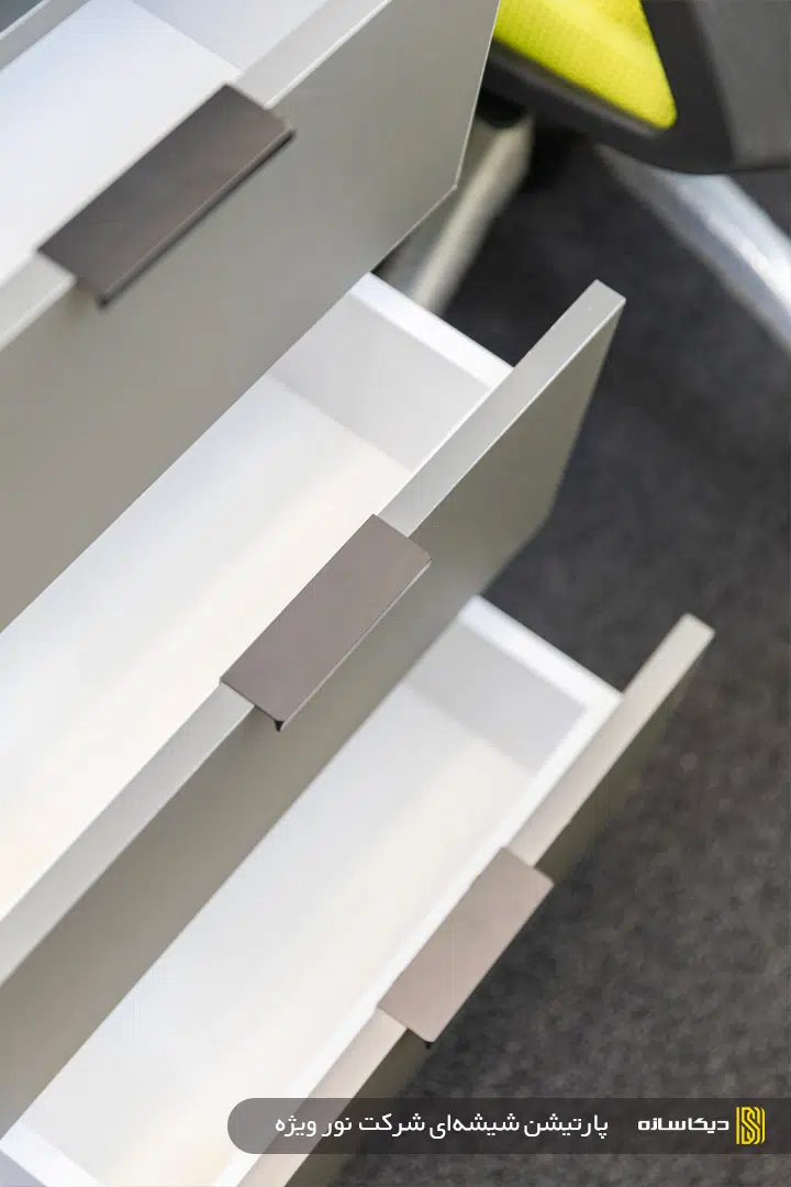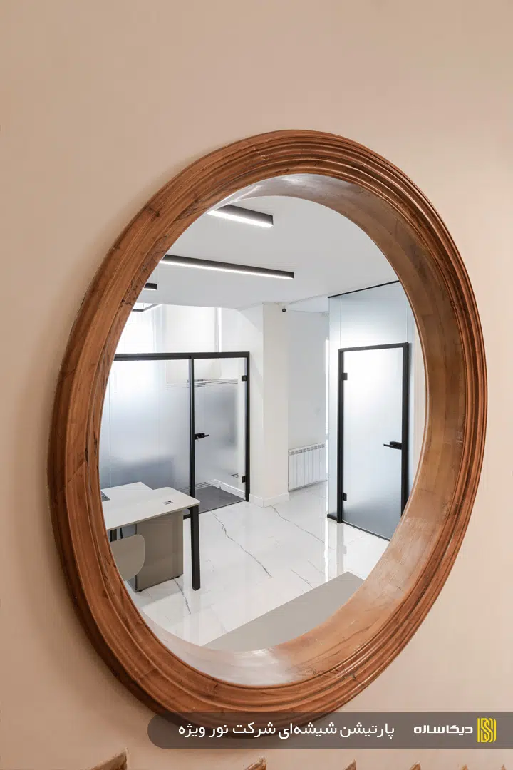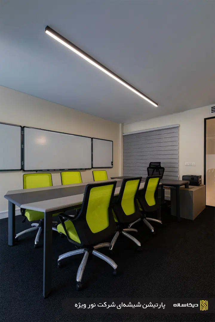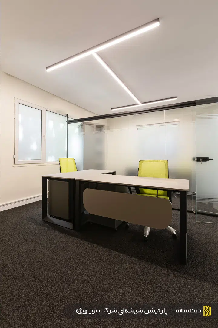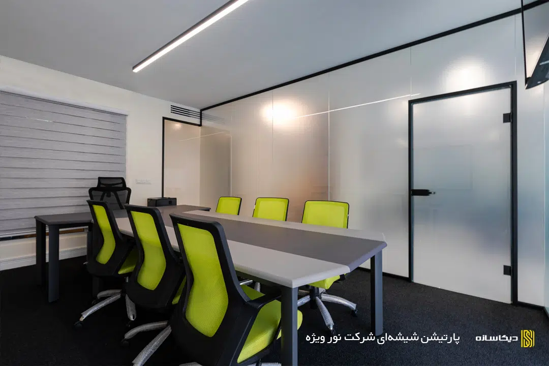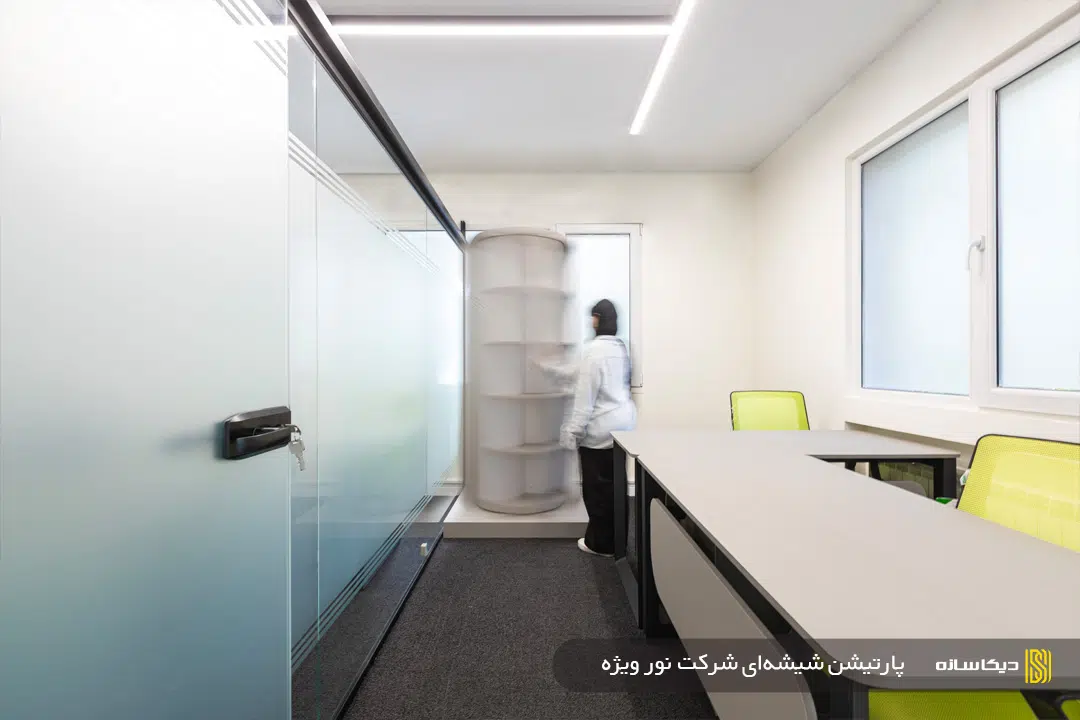 پارتیشن شیشهای و مبلمان اداری شرکت نور ویژه | طراحی و اجرای پارتیشن اداری شیشه ای و مبلمان اداری توسط شرکت دیکا سازه